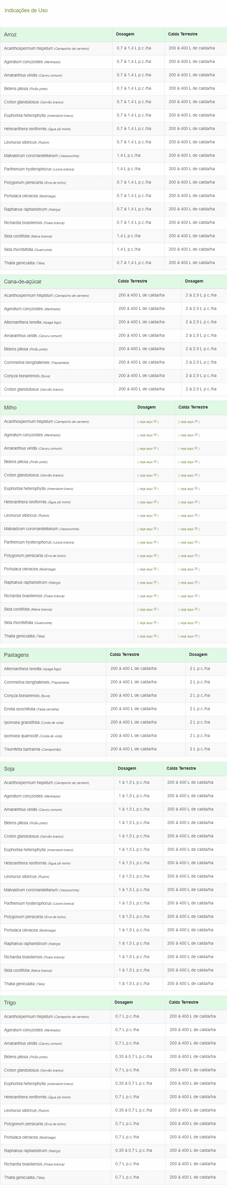 O produto 2,4-D AMINA 840 SL, é recomendado como eficiente no controle de plantas daninhas em aplicação pós-emergente nas culturas do arroz (na forma irrigada), trigo, milho, cana-de-açúcar e áreas de pastagens (Cynodon dactylon e Brachiaria decumbens). É recomendado também na aplicação em pré-plantio (manejo ou dessecação). Aplicação em pós-emergência das plantas daninhas para eliminação da vegetação antes do plantio, sistema de plantio direto para as culturas de milho e soja. Deve ser aplicado nas plantas daninhas já crescidas (pós-emergência) controlando as plantas daninhas de folhas largas.