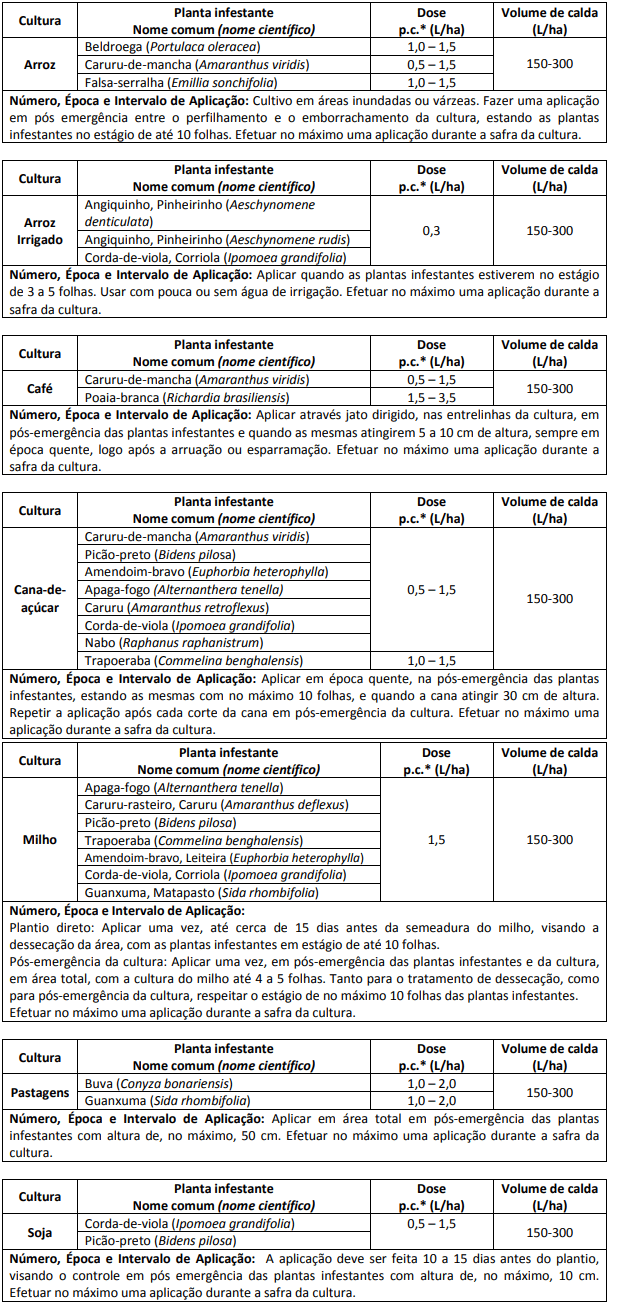 CULTURAS, PLANTAS INFESTANTES, DOSES, NÚMERO, ÉPOCA E INTERVALO DE APLICAÇÃO: