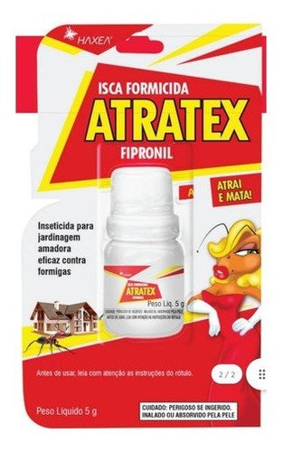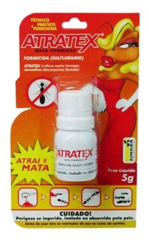 Atratex é uma isca formicida que atrai e mata formigas caseiras. As formigas transportam os grânulos para o ninho, ingerem o produto e o distribuem “boca a boca” para todos os indivíduos da colônia, inclusive rainhas e formas jovens.Atratex começa a fazer efeito 24 horas após a ingestão, tempo suficiente para o formigueiro estar comprometido.Detalhes do produto:- Quantidade: 1 embalagem com 5g cada- Eficaz contra formiga caseira