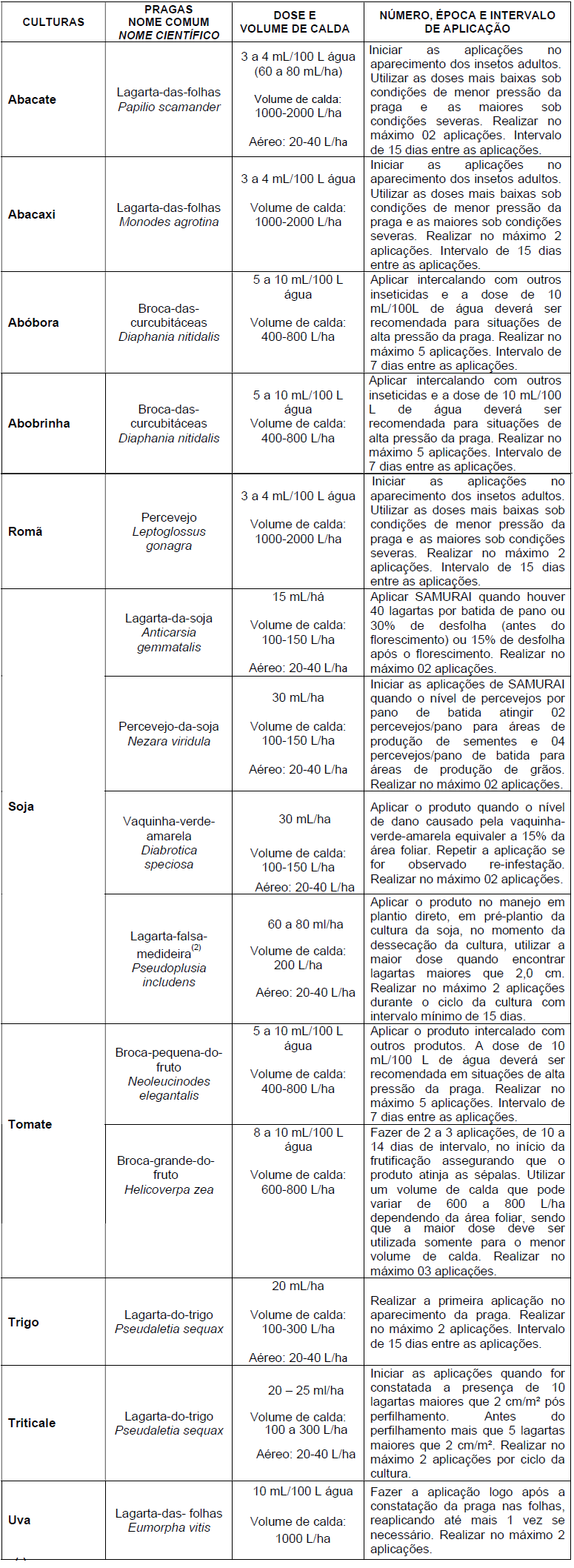 A dose recomendada do SAMURAI deve ser diluída em água e aplicada sob a forma de